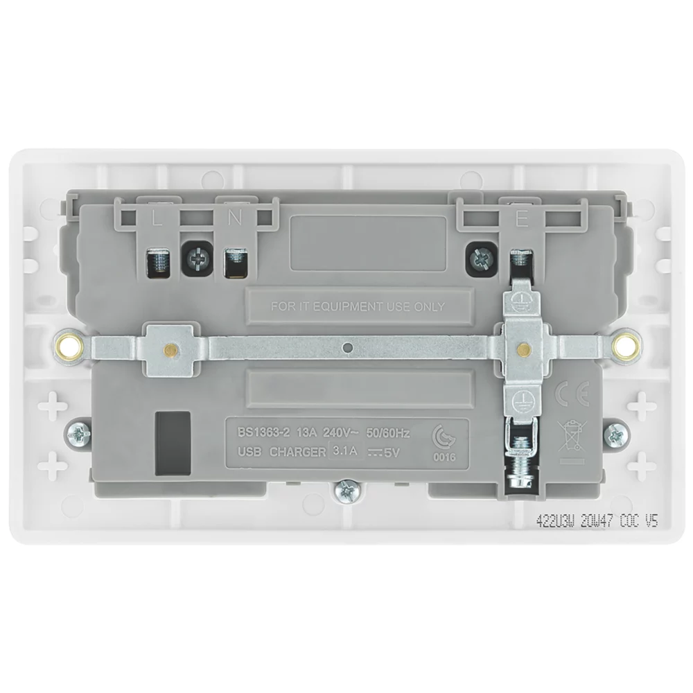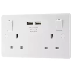 White moulded socket with 2 x USB charging ports. Features angled, in-line terminals and includes backed-out captive screws for easy installation. Ideal for charging iPads, iPhones, tablets, mobiles, cameras, MP3s and many more devices.