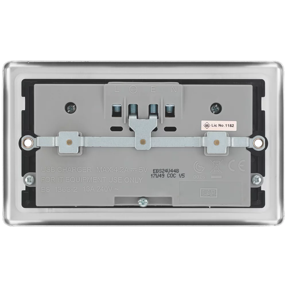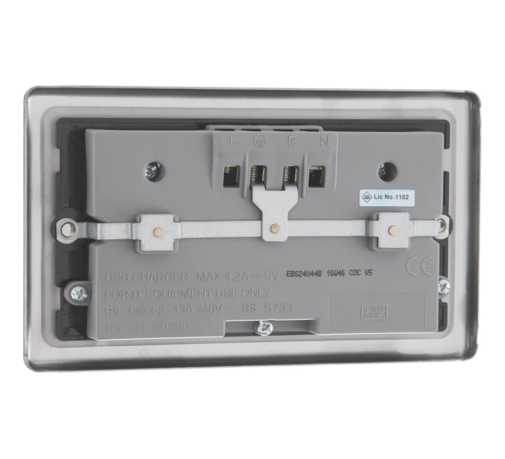Decorative metal socket with 4 USB charging ports. Ideal for charging iPads, iPhones, tablets, mobile phones, cameras and MP3s. Features angled, in-line terminals and backed-out captive screws for easy installation.