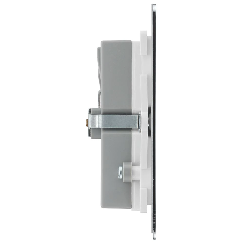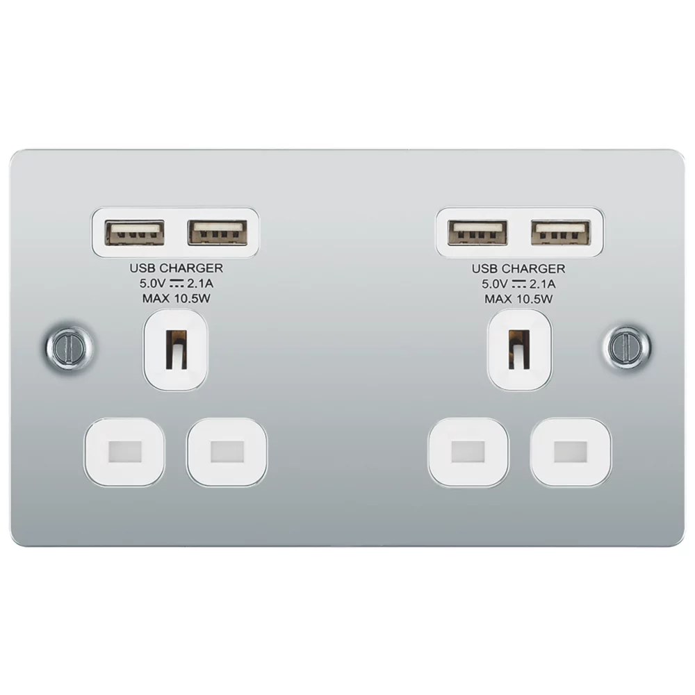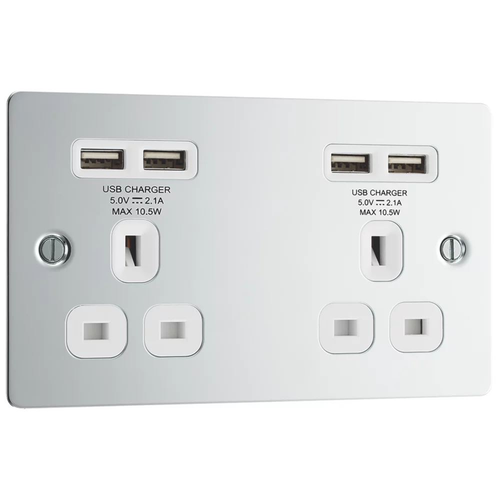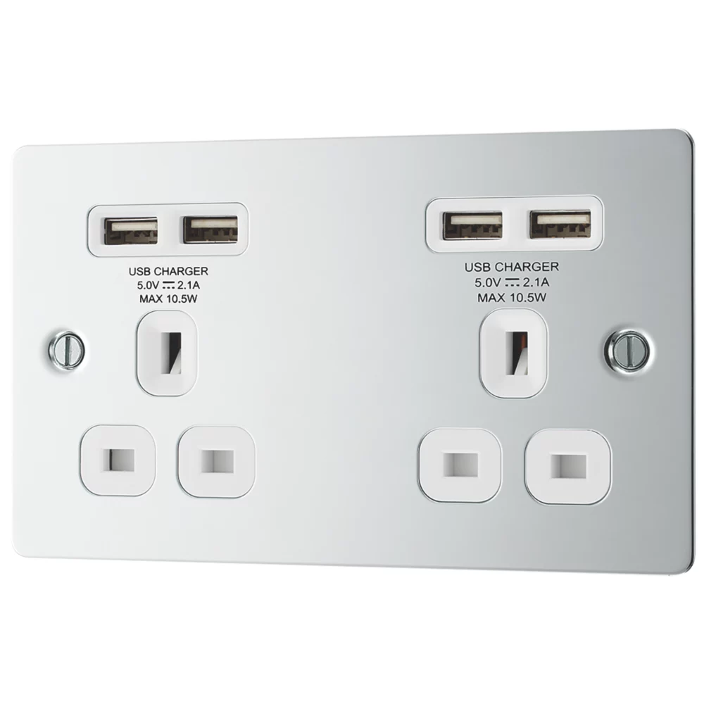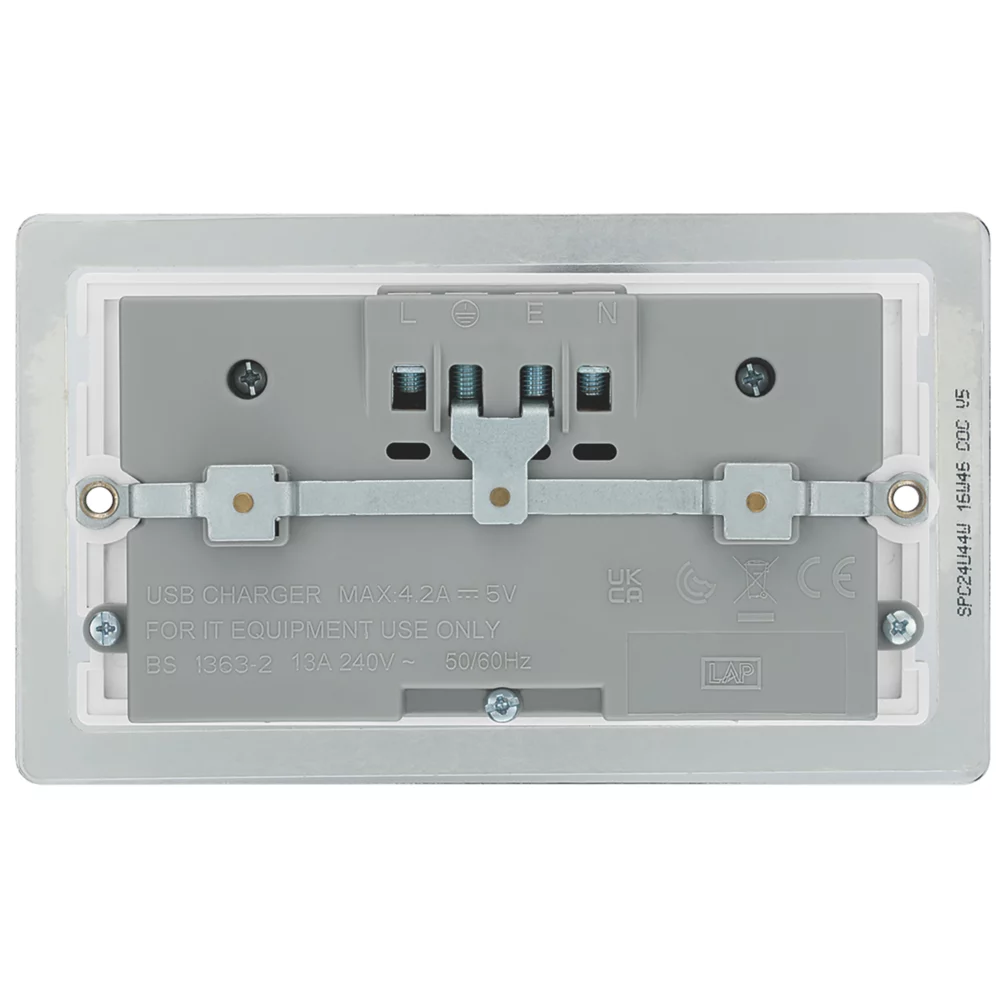 Decorative metal socket with 4 USB charging ports. Ideal for charging iPads, iPhones, tablets, mobile phones, cameras and MP3s. Features angled, in-line terminals and backed-out captive screws for easy installation. Integral moisture protection gasket.