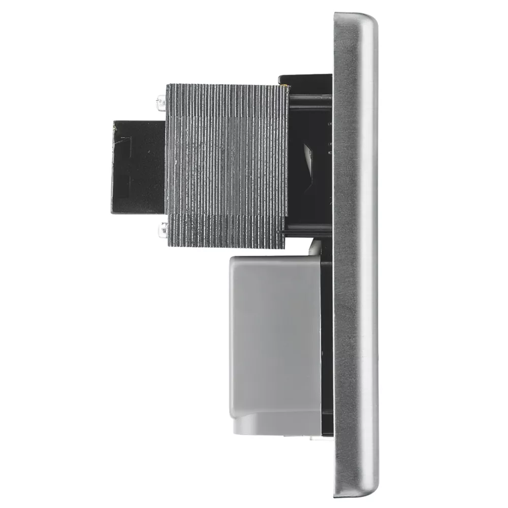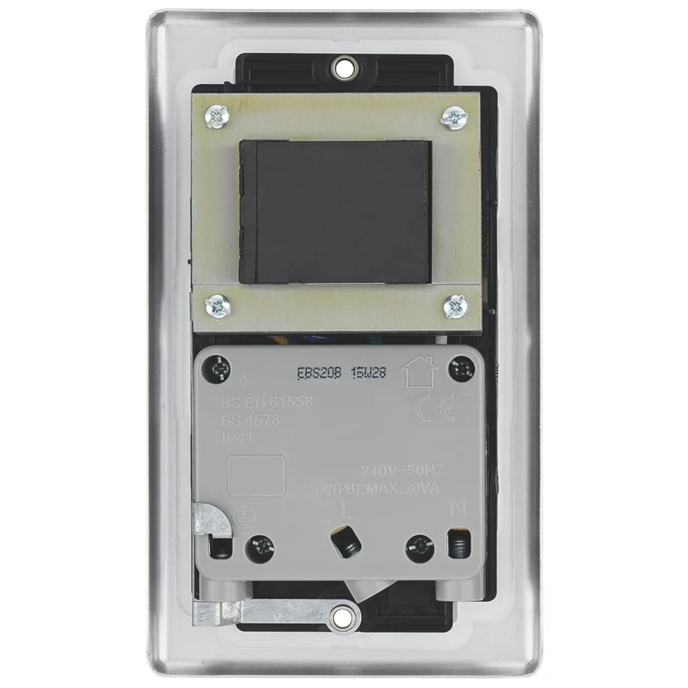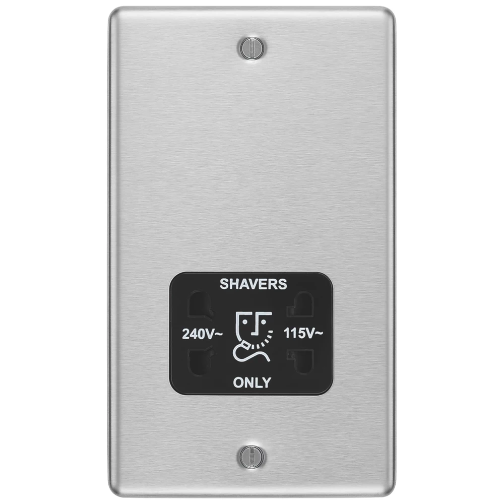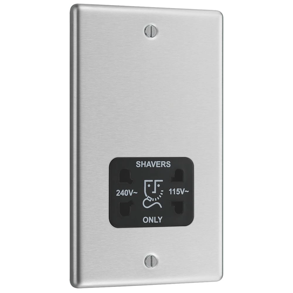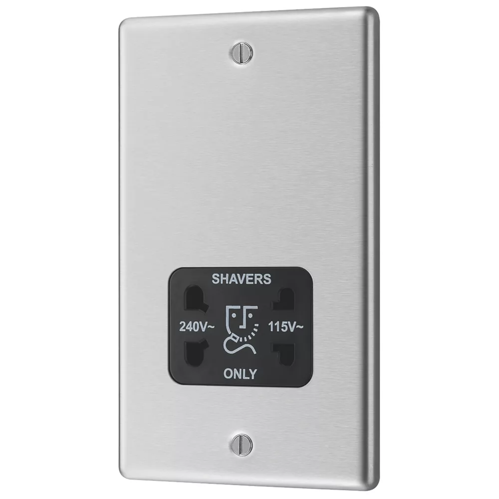 Stainless steel shaver socket with black insert, integral moisture protection gasket.