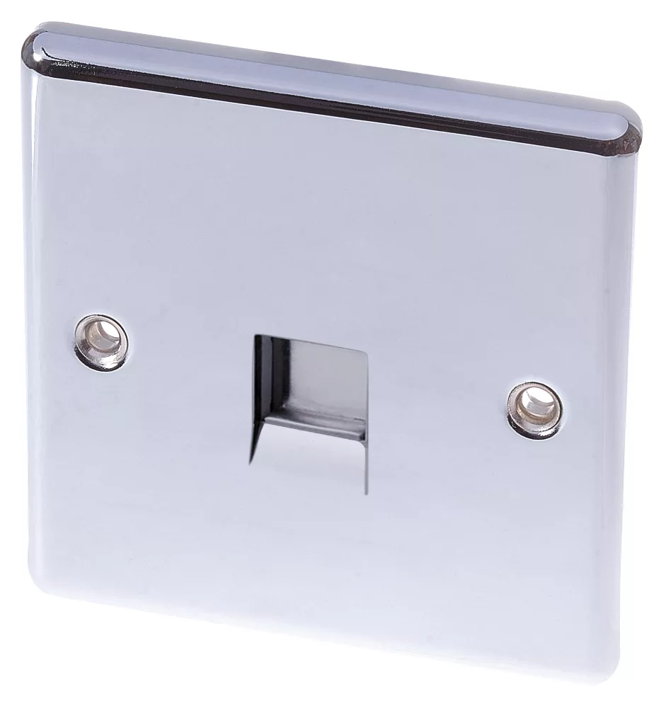 Polished chrome master telephone socket with shutter and integral moisture protection gasket.