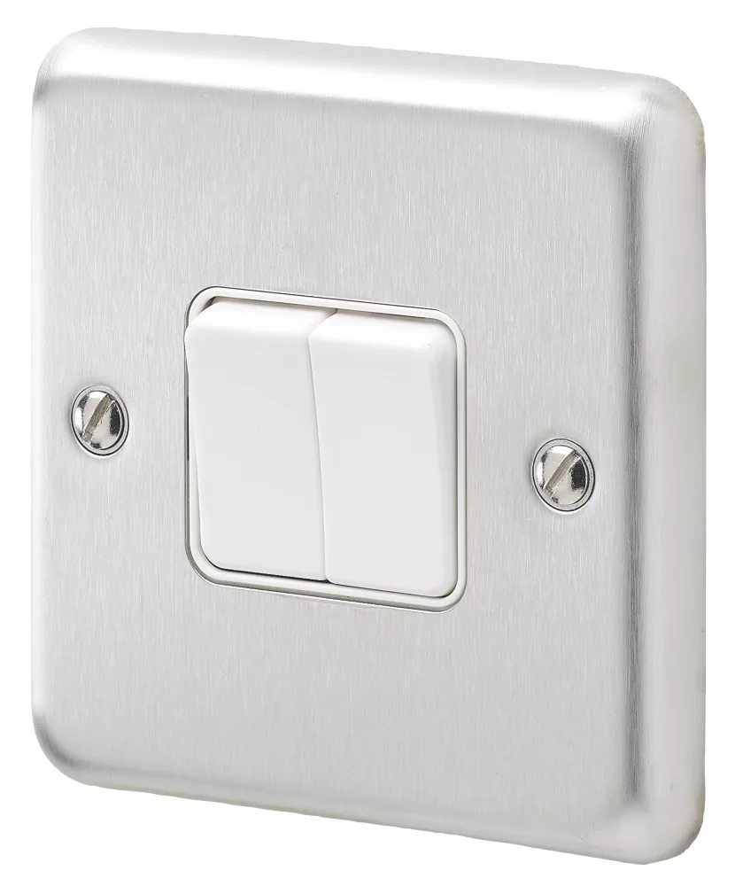 Light switch with 9mm profile and rounded corners. Upwards facing terminals with backed-out and captive screws for easy installation.