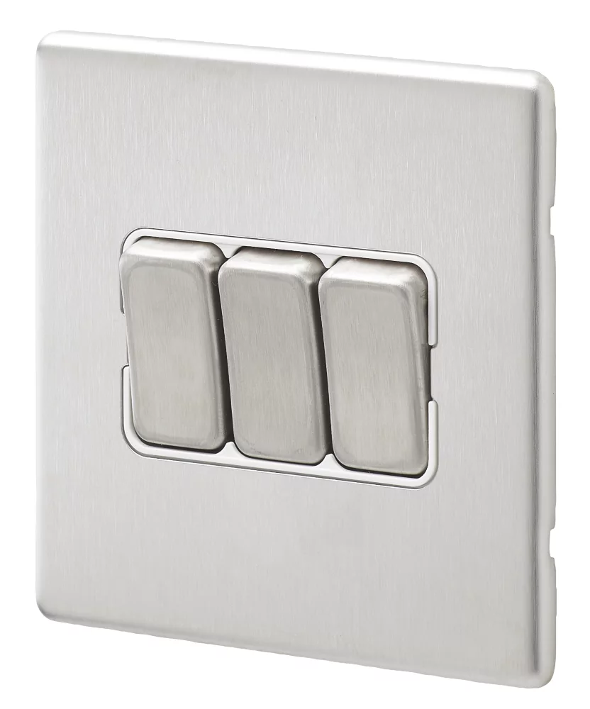 Contemporary switch with slim profile. Upward facing terminals with backed-out and captive screws for easy installation.