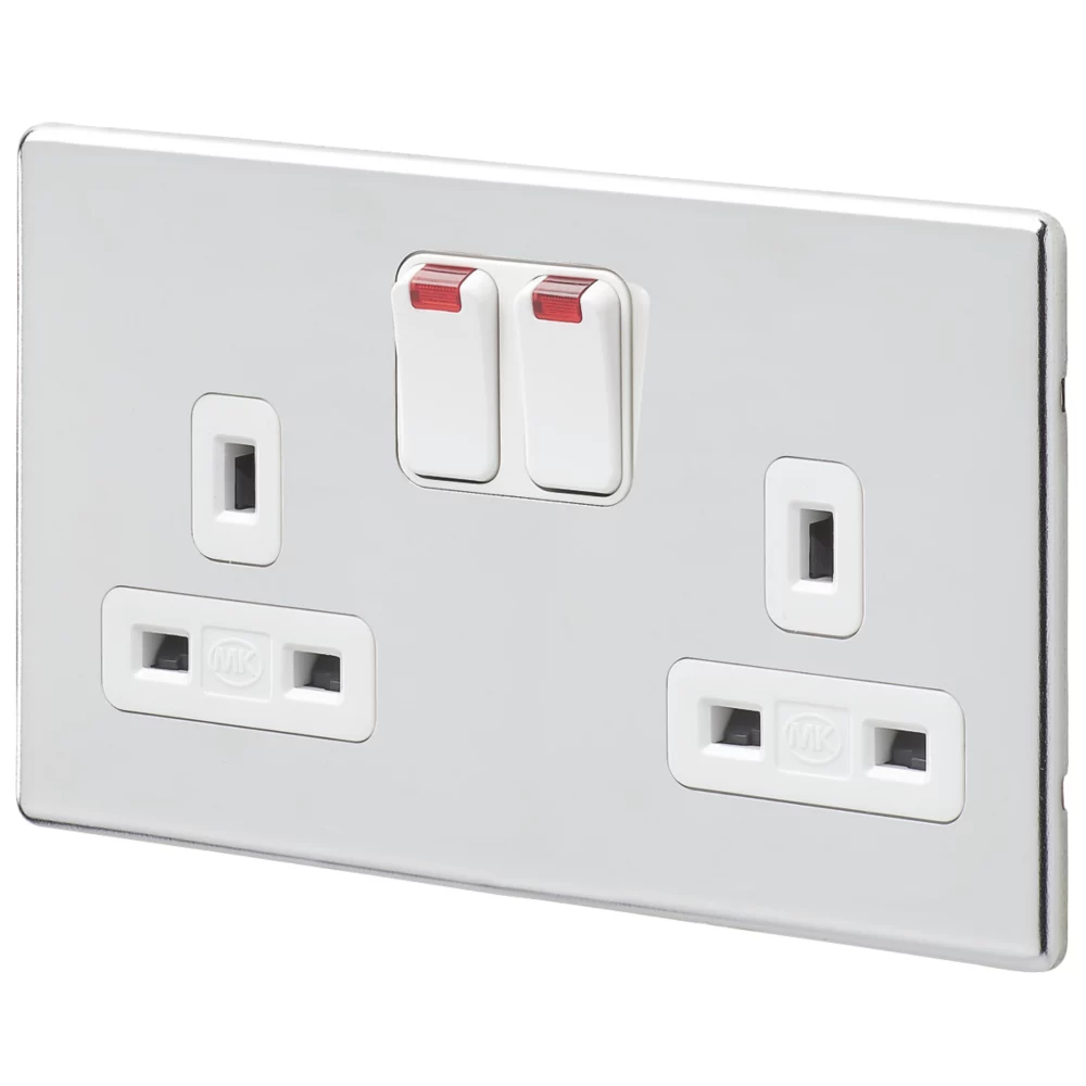 MK Aspect 13A 2-Gang DP Switched Plug Socket Polished Chrome With Neon With White Inserts