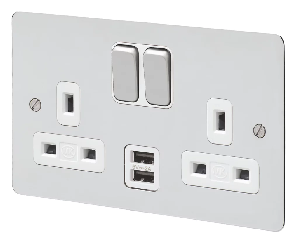 Contemporary switched socket with 2 USB ports. Upwards facing terminals with backed-out and captive screws for easy installation. Dynamic device recognition means the socket can detect different charging requirements and react accordingly for optimal charging efficiency. USB is protected against overload or short-circuit. 3-pin child-resistant shutter system is designed to inhibit access to the electricity supply unless all 3 pins are in position.