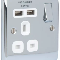 British General Nexus Metal 13A 1-Gang SP Switched Socket + 2.1A 2-Outlet Type A USB Charger Polished Chrome With White Inserts