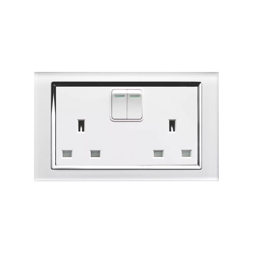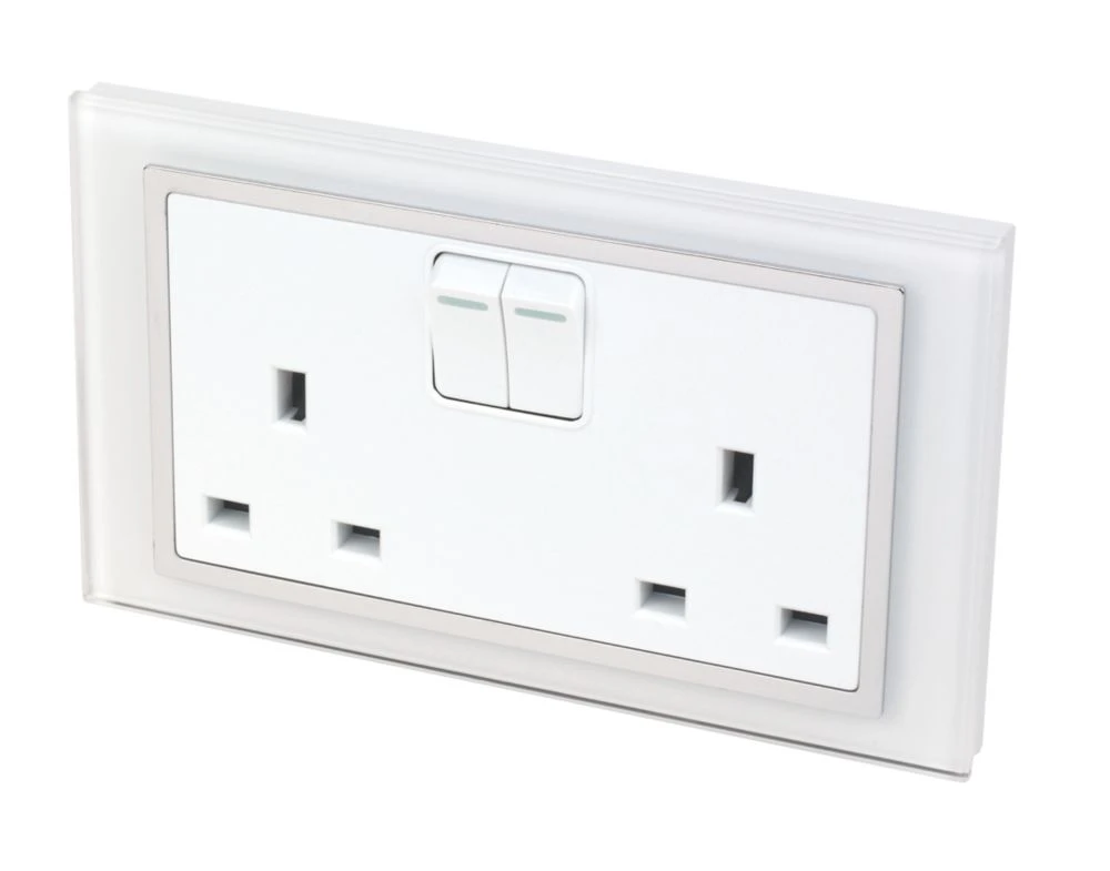 Modern glass design double pole switched socket with chrome trim, concealed screws and tru white glass finish.