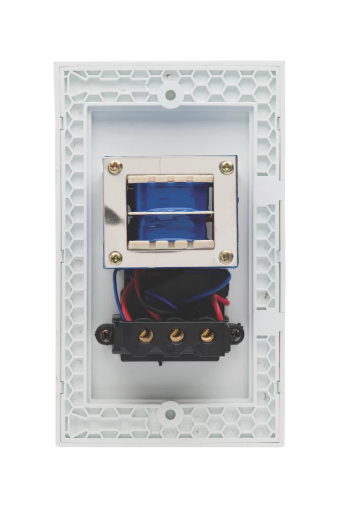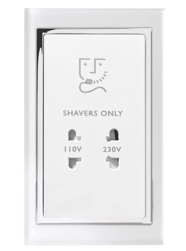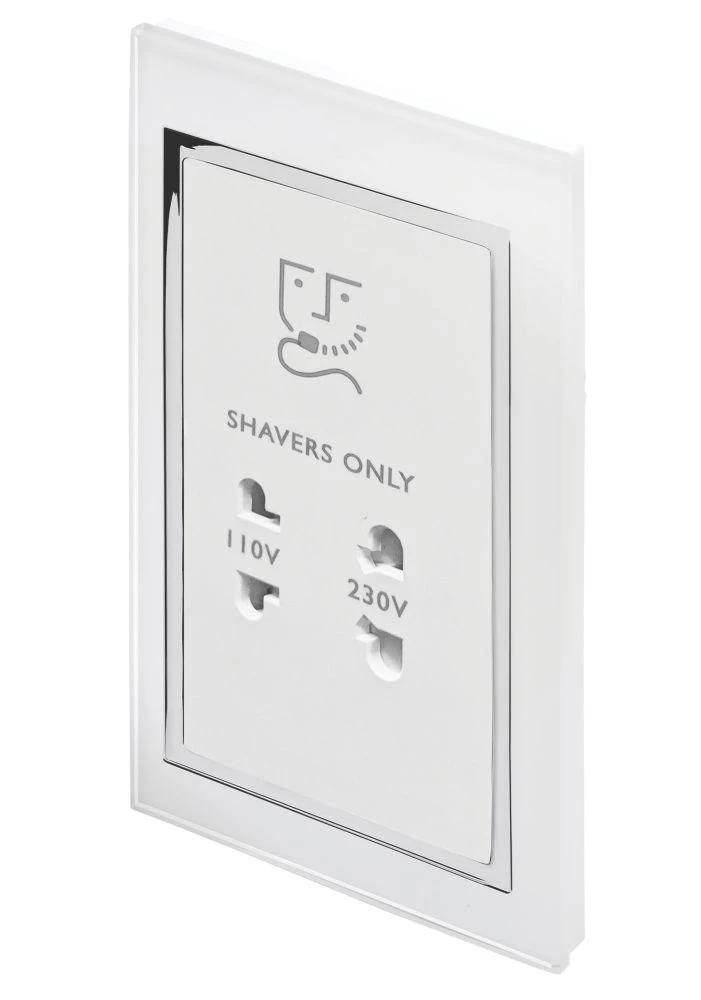 Modern glass design, dual voltage shaver with chrome trim, tru white glass finish and concealed screws.