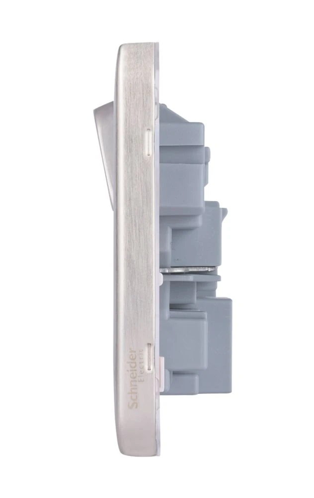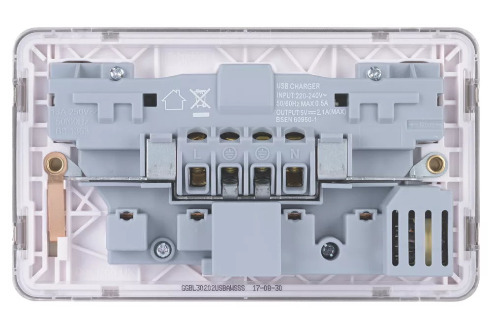 Modern switched socket with 2 USB ports, ideal for new construction and refurbishment projects. Removable screwless cover and reliable clip-in system makes painting and decorating easy. Angled and in-line terminals with backed-out and captive screws.