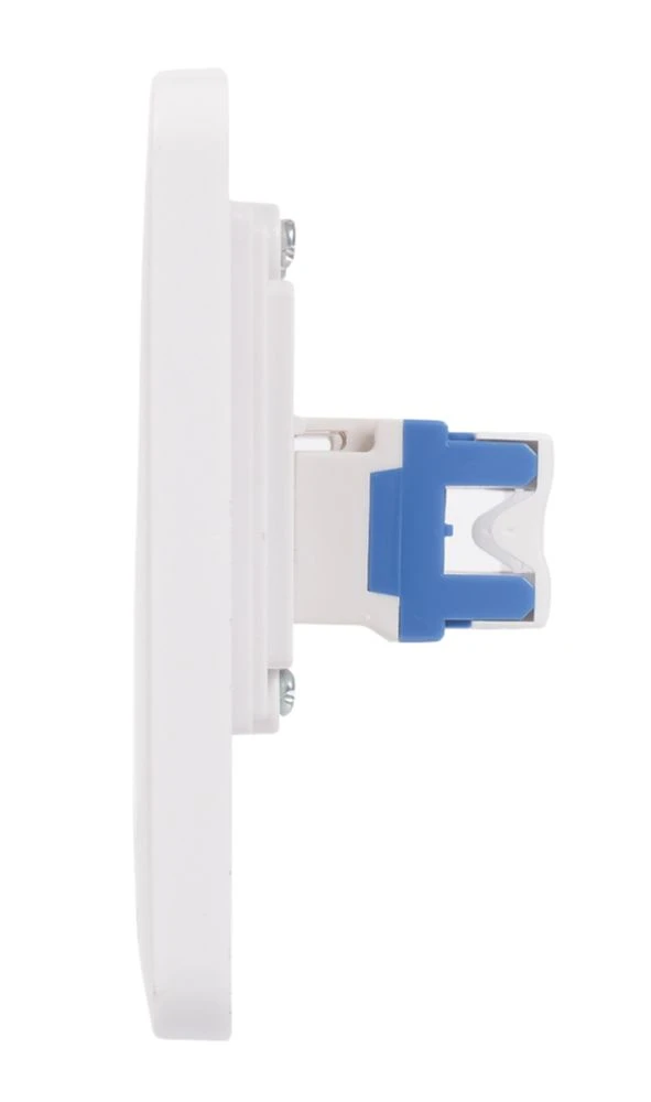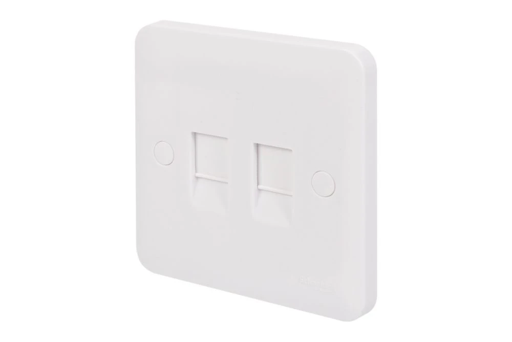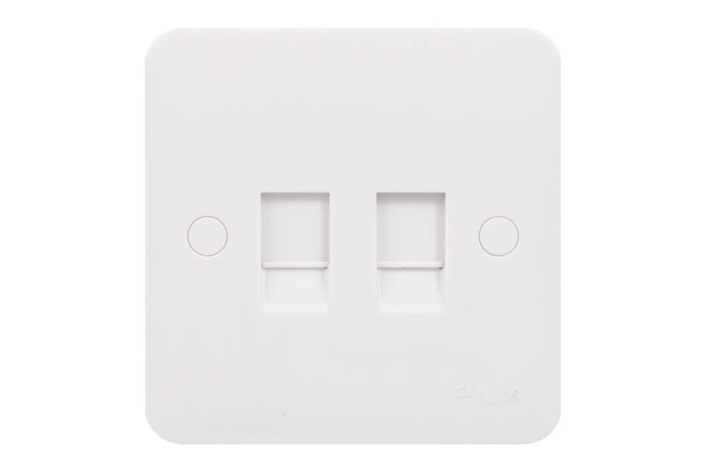 Double RJ45 Cat 5E outlet. Smooth, soft-curved plate profile. Made from durable, high quality urea with antimicrobial properties. Ideally suited for new constructions and refurbishment projects. Supplied with screw cap covers for a sleek finish.