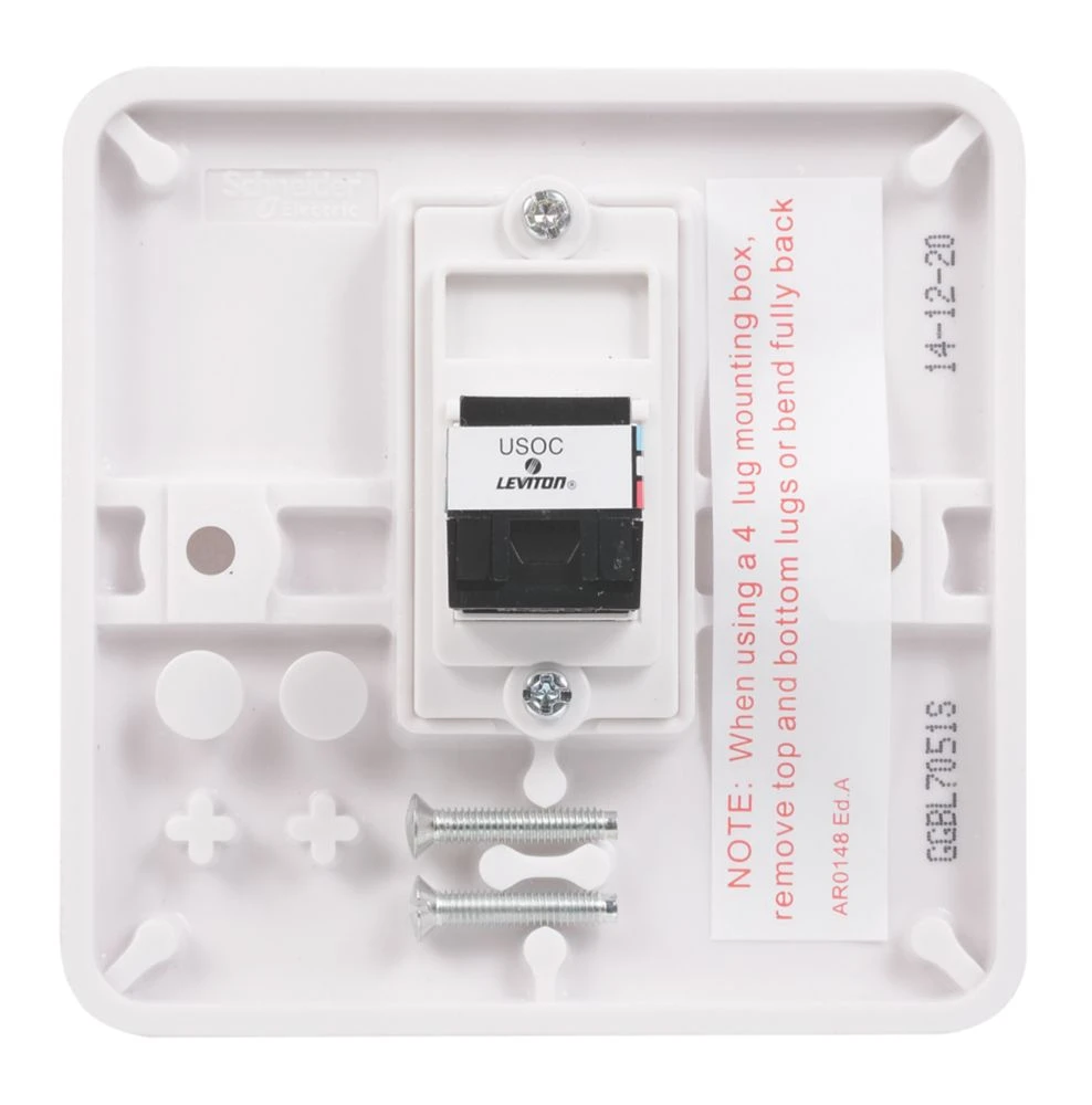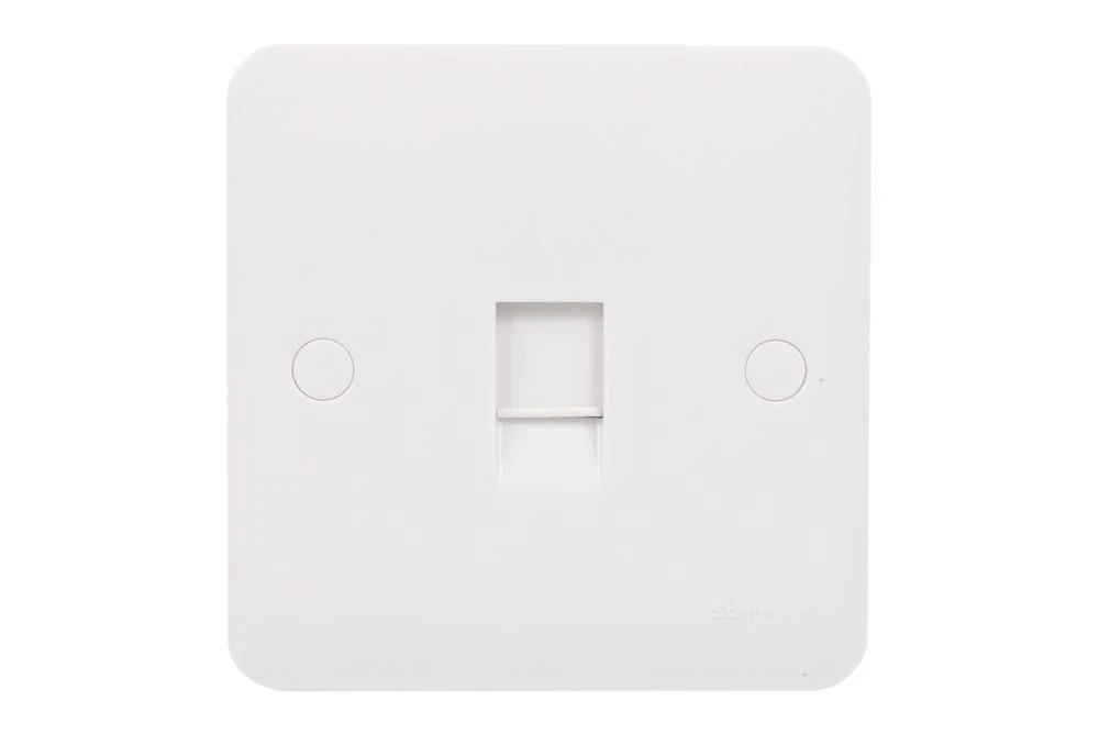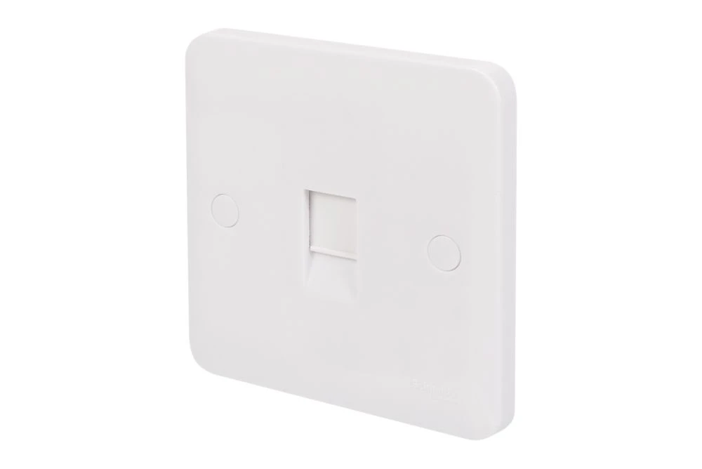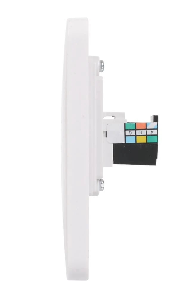 RJ12 telephone and data outlet. Smooth, soft-curved plate profile. Made from durable, high quality urea with antimicrobial properties. Ideally suited for new constructions and refurbishment projects. Supplied with screw cap covers for a sleek finish.