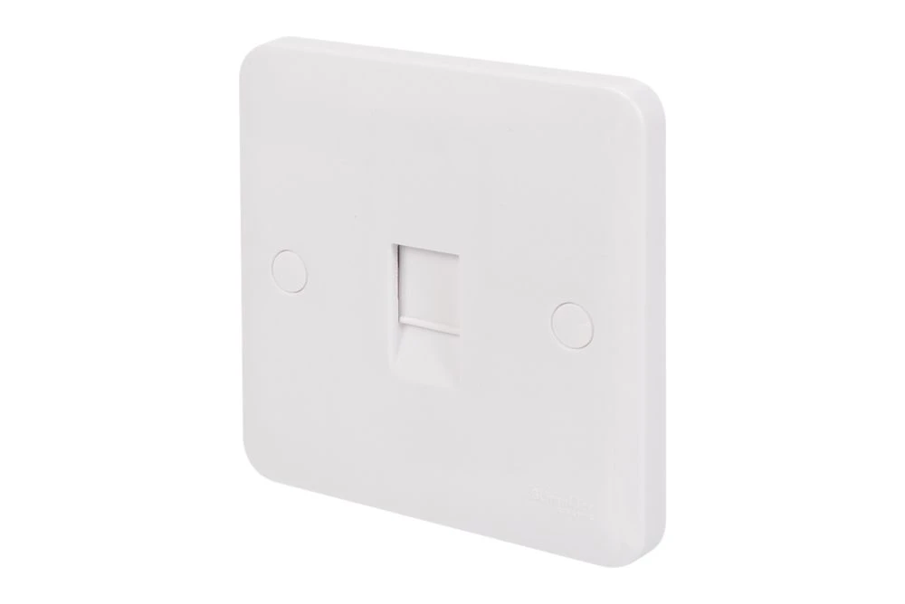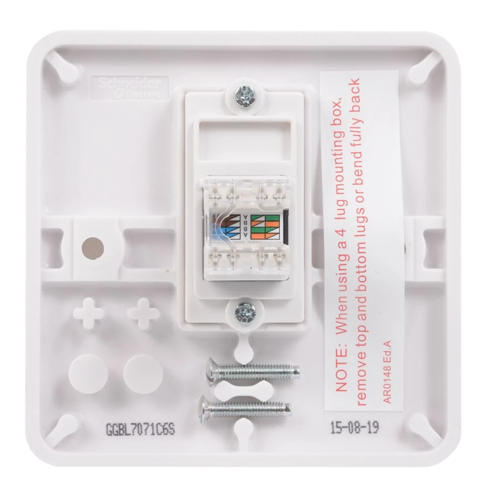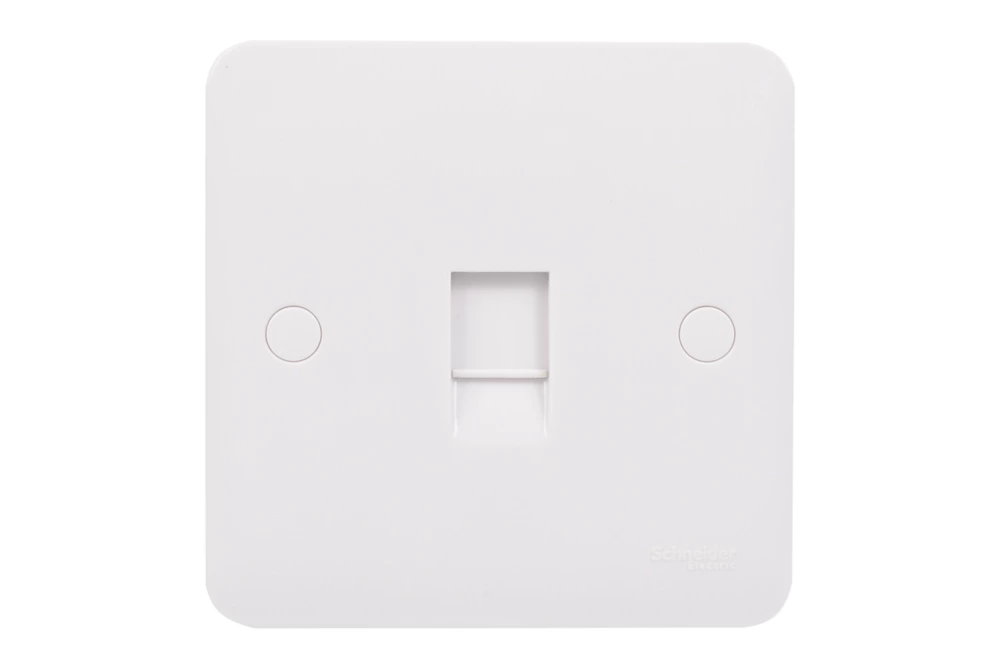 Single RJ45 Cat 6 outlet. Smooth, soft-curved plate profile. Made from durable, high quality urea with antimicrobial properties. Ideally suited for new constructions and refurbishment projects. Supplied with screw cap covers for a sleek finish.