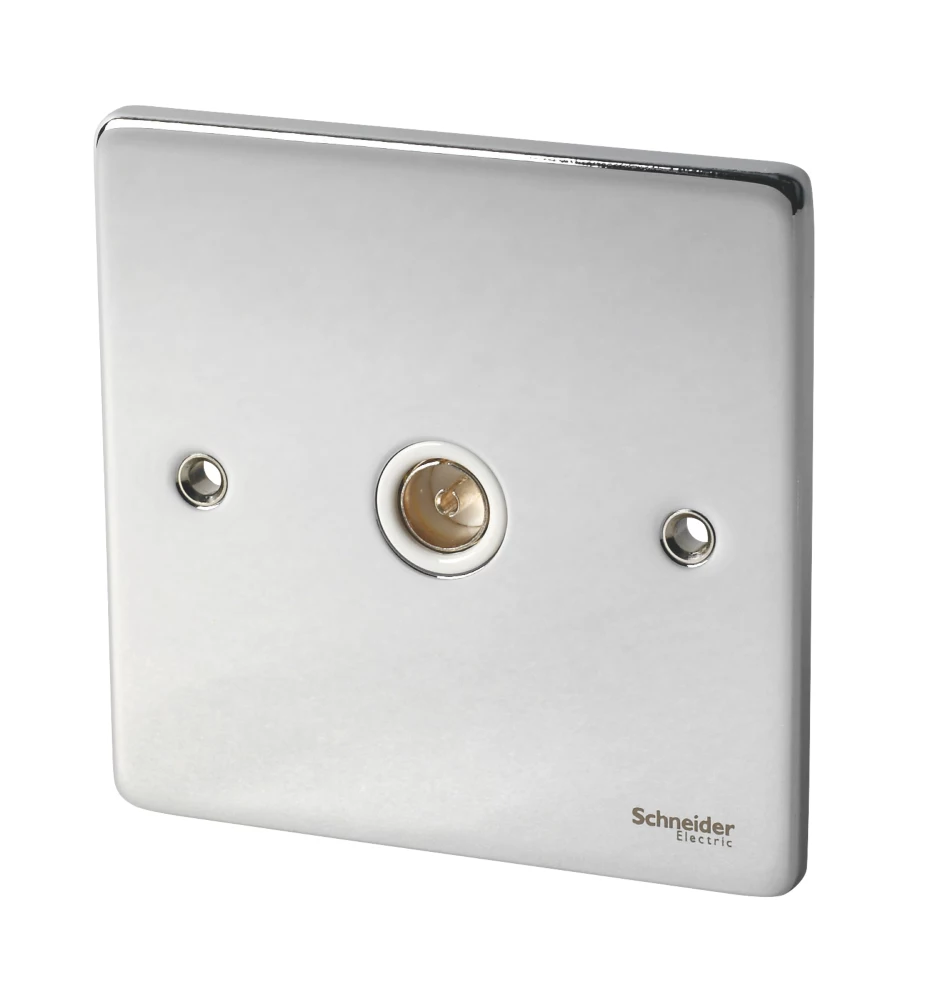 Low profile coaxial socket. Contemporary, soft-curved edge design with polished chrome finish. Colour-matched faceplate screws.