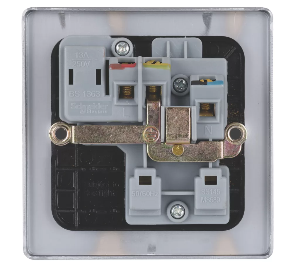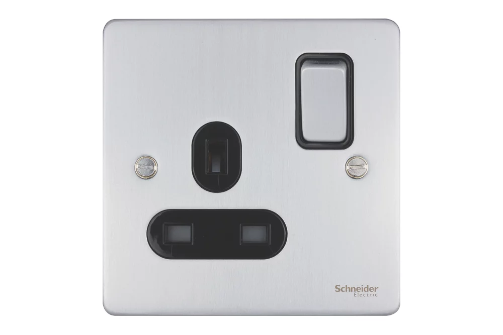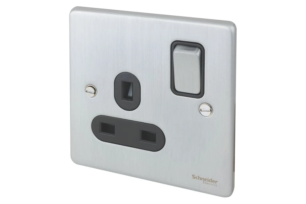 Low profile 1-gang switched socket with contemporary soft-curved edge and concealed fixings.