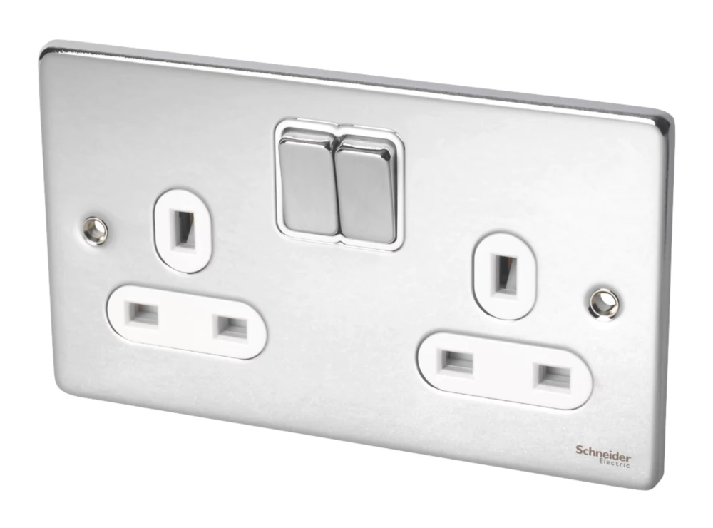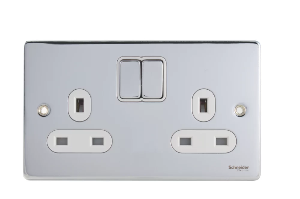 Low profile 2-gang single-pole switched socket with contemporary soft-curved edge.