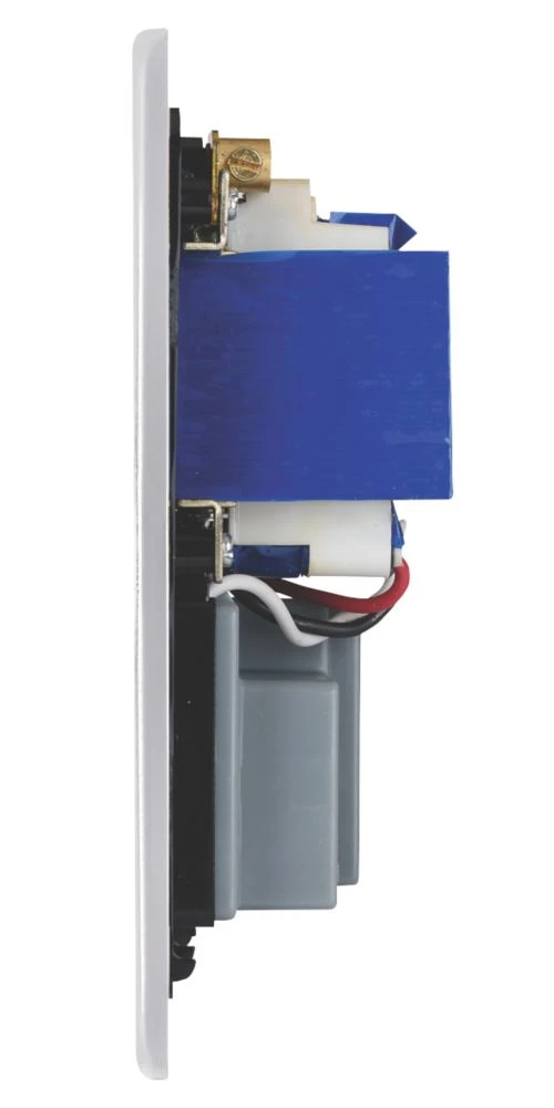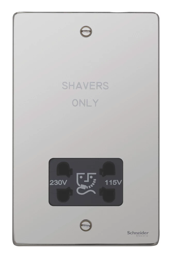 Low profile dual voltage shaver socket with contemporary soft-curved edge. Polished chrome with black inserts.