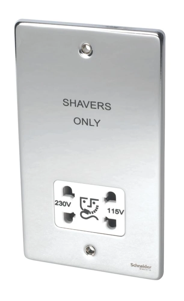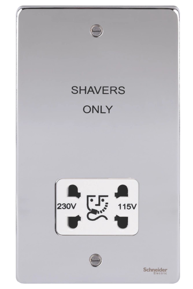 Low profile dual voltage shaver socket with contemporary soft-curved edge. Polished chrome with white inserts.