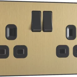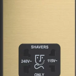 British General Evolve 2-Gang Dual Voltage Shaver Socket 115/240V Satin Brass With Black Inserts