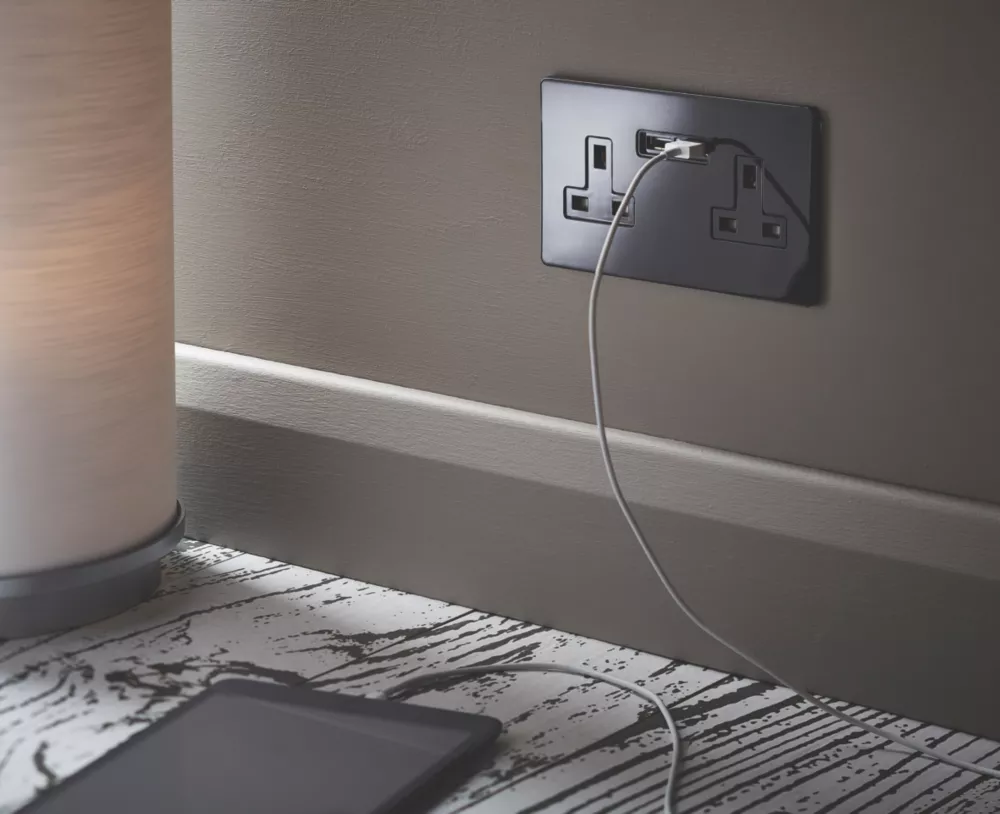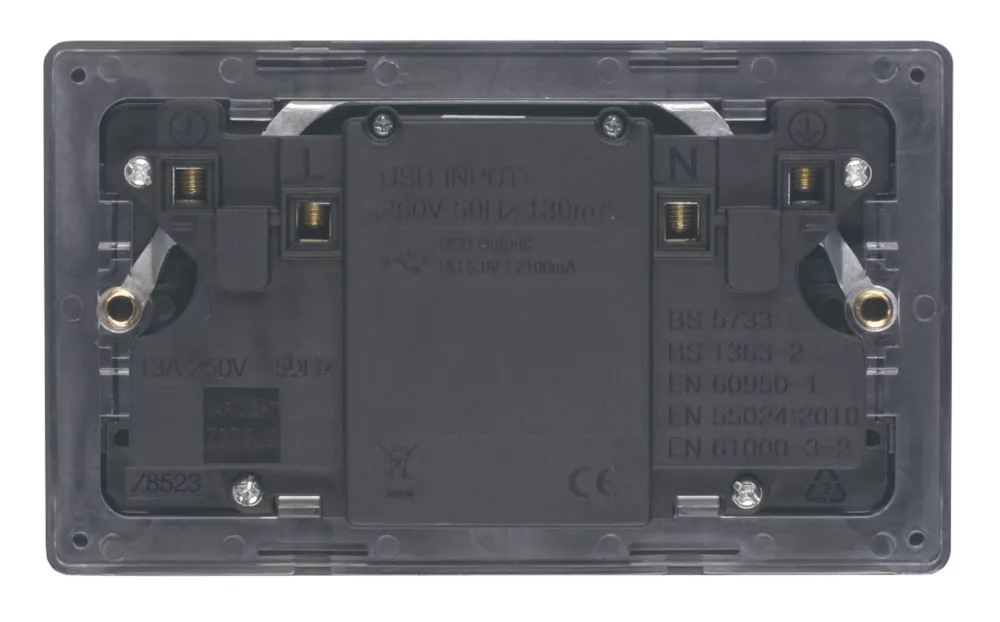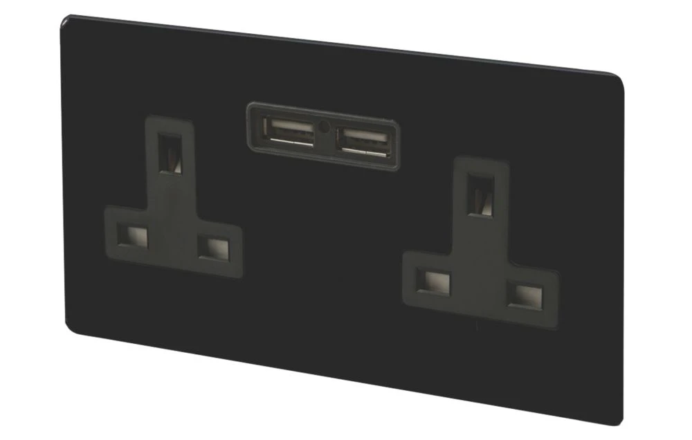 Varilight 13AX 2-Gang Unswitched Socket + 2.1A 2-Outlet Type A USB Charger Jet Black With Black Inserts