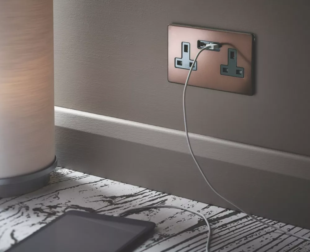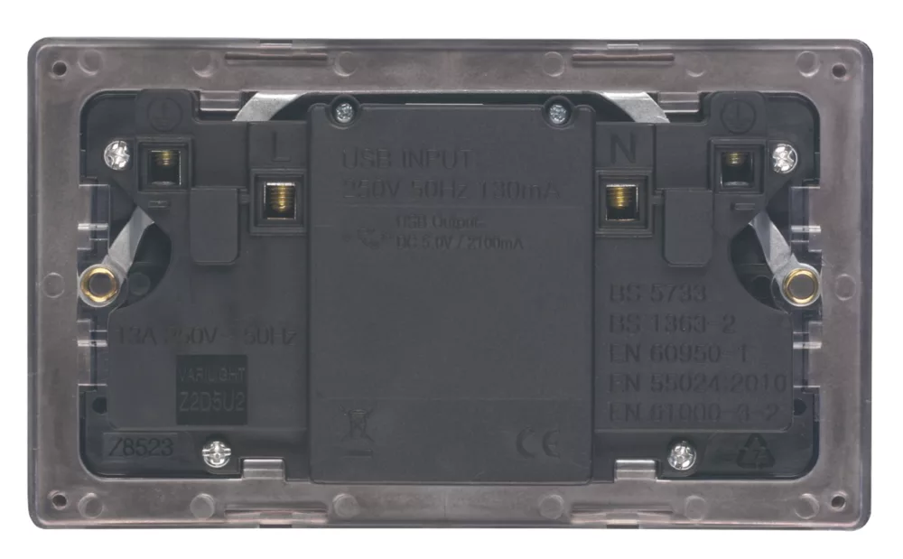 Slim, low profile, screwless faceplate for a sleek, contemporary style. Ideal for charging iPads, iPhones, tablets, mobiles and cameras. USB charging ports can be used with any device, the left-hand USB charging port is optimised for Apple devices and the right-hand USB is for non-Apple devices. Supplied with concealed fixings.