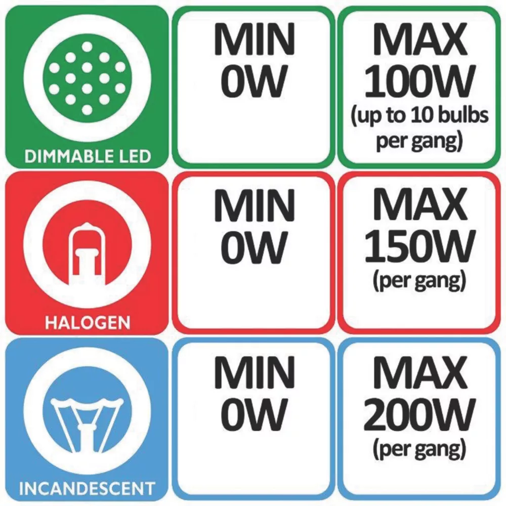 Polished chrome controls. Can be controlled via the touch button, dedicated remote control handset or spare button on an existing remote control handset. Minimum load level for the dimmer can be set to optimise the dimming range of a particular lighting load. Suitable for domestic or commercial installations. Compatible dedicate handset sold separately (Codes 90341 and 1695J). Compatible with multi-way slave unit (Code 2061K).